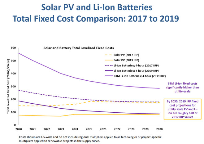 與之前的綜合資源計劃(IRP)相比,太陽能發(fā)電和儲能系統(tǒng)大幅增加的部分原因是,這兩種技術(shù)的降價速度比預(yù)計的要快得多(如下圖所示)。建模表明,2019年電網(wǎng)規(guī)模的太陽能+儲能成本大約是2017 年綜合資源計劃(IRP)的一半。同樣在2018年,其首選的綜合資源計劃(IRP)中的溫室氣體減排成本為已下跌近50%,達(dá)到每噸113美元。