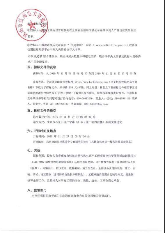 中國儲能網(wǎng)訊:10月6日,珠海鈺海電力有限公司發(fā)布招標(biāo)公告,擬為其兩臺天然氣熱電聯(lián)產(chǎn)機(jī)組(2*465MW)配置14MW/7MWh磷酸鐵鋰儲能調(diào)頻系統(tǒng)。該天然氣熱電聯(lián)產(chǎn)工程為京能集團(tuán)投資建設(shè)。