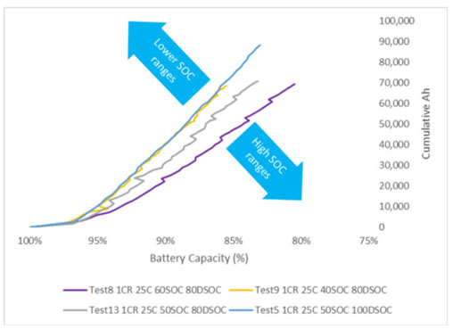 DNV GL公司的一個(gè)研究小組增加了測(cè)試電池產(chǎn)品的數(shù)量(16種電池),并增加了測(cè)試項(xiàng)目,以包括近500條單獨(dú)的電池測(cè)試曲線。DNV GL的電池產(chǎn)品合格計(jì)劃(PQP)測(cè)試了電池的四種“濫用因素”:平均充電狀態(tài)(SOC)、平均充電狀態(tài)(SOC)波動(dòng)(或窗口)、電池充放電速率(C速率)和溫度。其邏輯是這四個(gè)變量主要決定電池的退化行為,并且了解它們對(duì)退化的影響,用戶可以在項(xiàng)目財(cái)務(wù)模型中獲得有關(guān)更換電池時(shí)間間隔的信息,從而了解電池更換成本。