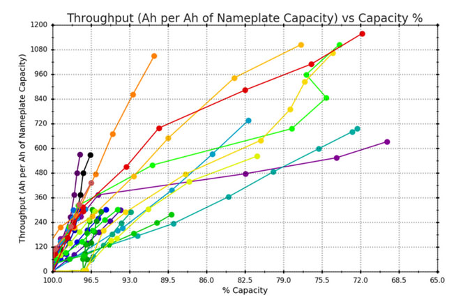 DNV GL還希望引入一個(gè)新術(shù)語(yǔ),以便在考慮電池工作壽命時(shí)考慮與“循環(huán)”相對(duì)應(yīng)的情況,即“吞吐量”(有時(shí)是“周轉(zhuǎn)率”),它實(shí)際上是考察流經(jīng)電池的總電量。例如,研究隨著容量退化,電池每個(gè)充放電周期輸送的總能量將如何變化。如下圖所示。