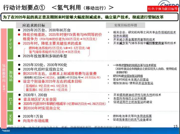 交通方面,政府制定目標(biāo)大幅度削減成本,確立量產(chǎn)技術(shù)。日本的氫能發(fā)展戰(zhàn)略中對氫能汽車、加氫站、公交車、工廠搬運叉車等方面都設(shè)立了具體的發(fā)展目標(biāo)。如在2030年前建成900座加氫站,推廣氫能汽車80萬輛,公交車1200臺,、工廠叉車1萬臺臺。