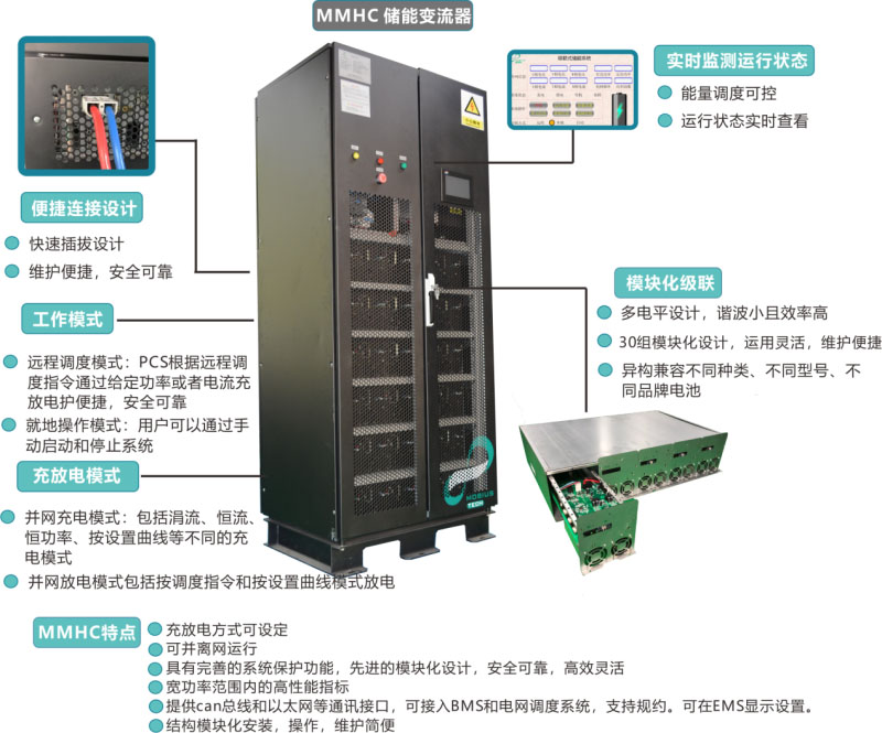 公司首創(chuàng)的MMHC所采用的技術(shù)路線,從根本上解決了因電池大規(guī)模串聯(lián)帶來的參數(shù)一致性要求高、壽命損失、木桶效應(yīng)等等一系列問題。所采用的技術(shù)體系從源頭實現(xiàn)了并網(wǎng)電壓與電池電壓的解耦、電池模組異構(gòu)兼容、模組間能量自然均衡、高效功率變換、高電能品質(zhì)、高安全性等諸多優(yōu)勢。