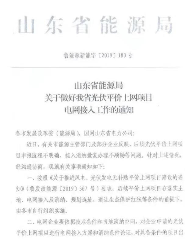 中國儲能網(wǎng)訊:近日,山東能源局印發(fā)了《關(guān)于做好我省平價(jià)上網(wǎng)項(xiàng)目電網(wǎng)接入工作的通知》,文件中指出,近期有市級主管部門以及企業(yè)反映,后續(xù)光伏平價(jià)項(xiàng)目存在項(xiàng)目申報(bào)流程不明確、接入消納批復(fù)辦理不順暢等情況,針對上述問題,山東能源局要求電網(wǎng)企業(yè)依據(jù)技術(shù)條件和當(dāng)?shù)叵{空間,對具備條件的項(xiàng)目出具電網(wǎng)接入和消納的原則性意見;各地主管部門要認(rèn)真審核平價(jià)項(xiàng)目相關(guān)材料,對具備條件的項(xiàng)目進(jìn)行確認(rèn);最后電網(wǎng)企業(yè)根據(jù)各市確認(rèn)的項(xiàng)目名單按權(quán)限及時(shí)出具接入消納批復(fù)意見。