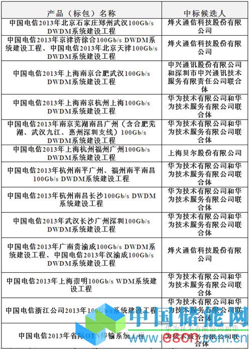 中國儲能網(wǎng)訊:中國電信2013年100G DWDM/OTN設備集中采購項目結果于今日出爐,從本次中標結果來看,獲得標包的四家設備商分別是華為技術有限公司和華為技術服務有限公司聯(lián)合體、中興通訊股份有限公司和深圳市中興通訊技術服務有限責任公司聯(lián)合體、烽火通信烽火通信科技股份有限公司、上海貝爾上海貝爾股份有限公司。其中華為獲得最多標包,這也表明華為在這一領域的優(yōu)勢和實力。華為憑借業(yè)界領先的100G技術和產(chǎn)品,在100G市場上贏得了主要份額。