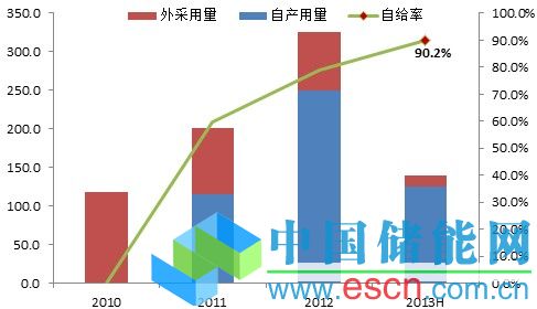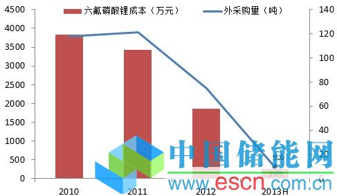 目前天賜材料生產(chǎn)的電解質僅供自己使用,2013年上半年的外部采購量僅為9.6噸,較2011年減少92.1%,基本實現(xiàn)自給自足。