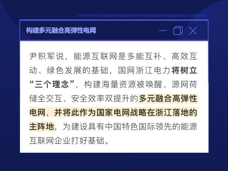 為此,國網(wǎng)浙江電力創(chuàng)造性地提出了,建設(shè)能源互聯(lián)網(wǎng)形態(tài)下的多元融合高彈性電網(wǎng),大幅提高全社會綜合能效水平,推動全社會綠色低碳發(fā)展,并將其作為打造“努力成為國家電網(wǎng)建設(shè)具有中國特色國際領(lǐng)先的能源互聯(lián)網(wǎng)企業(yè)的重要窗口”的主陣地,作為今后一段時間國網(wǎng)浙江電力工作的一條主線。
