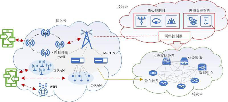 如圖4所示,5G網(wǎng)絡(luò)架構(gòu)可分為三個部分,分別為接入云、轉(zhuǎn)發(fā)云和控制云。接入云適應(yīng)各種無線鏈路接入,可實現(xiàn)高效的數(shù)據(jù)感知,網(wǎng)絡(luò)拓?fù)湄S富,有著集中式接入和分布式接入兩種接入架構(gòu)。轉(zhuǎn)發(fā)云在控制云的控制下,實現(xiàn)數(shù)據(jù)的低時延高效傳輸。控制云控制全局的信息管理并保證5G通信服務(wù)質(zhì)量,根據(jù)業(yè)務(wù)不同提供不同的差異化服務(wù),保證每個業(yè)務(wù)對象的需求。