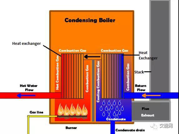 在天然氣轉(zhuǎn)化為熱能的過程中,與常規(guī)鍋爐相比, 冷凝鍋爐可以在耗費(fèi)相同燃?xì)獾那闆r下產(chǎn)生更多的能量。傳統(tǒng)的鍋爐排煙溫度在110℃-200℃左右,冷凝鍋爐冷凝燃燒技術(shù)可以將煙氣溫度降到50度,將部分煙氣冷凝成液態(tài),吸收了煙氣從氣體變?yōu)橐后w的熱量,也就是回收了原來被煙氣帶走的熱量,如此一來就充分利用了熱量,大大降低了熱量損失。所以熱效率比普通鍋爐高許多,可達(dá)98%。