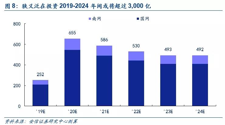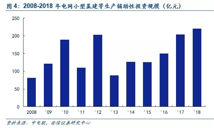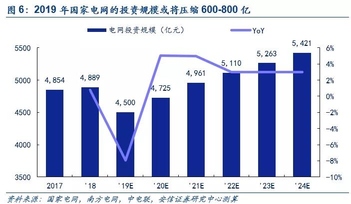 3、2019年國家電網(wǎng)的投資規(guī)?;?qū)嚎s600-800億。2019國家電網(wǎng)規(guī)劃投資額為5,126億元,從19年前3季度電網(wǎng)經(jīng)營和投資情況來看,我們判斷全年投資額會有所削減。在我們對泛在投資規(guī)模的測算中,我們預計國家電網(wǎng)公司2019年投資額會減少至4,500億。