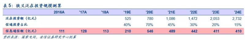 根據(jù)近期泛在建設(shè)的推進情況來看,我們判斷2020年或?qū)⑹切畔⑼ㄐ蓬惤ㄔO(shè)的大年,因此對2020-2024年間狹義泛在的投資測算進行了更新。