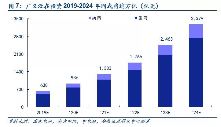 同時,南方電網(wǎng)公司亦在同步執(zhí)行其《公司數(shù)字化轉(zhuǎn)型和數(shù)字南網(wǎng)建設(shè)行動方案》,數(shù)字南網(wǎng)的發(fā)展方向和目標與國網(wǎng)的泛在電力物聯(lián)網(wǎng)建設(shè)規(guī)劃不謀而合。從過往南方電網(wǎng)公司的經(jīng)營數(shù)據(jù)來看,其經(jīng)營體量約為國網(wǎng)的20%,每年電網(wǎng)投資額也約為國網(wǎng)的20%。因此,我們對南方電網(wǎng)未來5年數(shù)字南網(wǎng)建設(shè)的投資額以國網(wǎng)的20%水平進行估算?;谌缟蠝y算,兩家電網(wǎng)公司2019-2024年間合計在泛在電力物聯(lián)網(wǎng)方面的投資將會達到10,377億元。