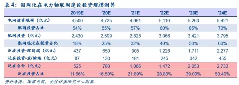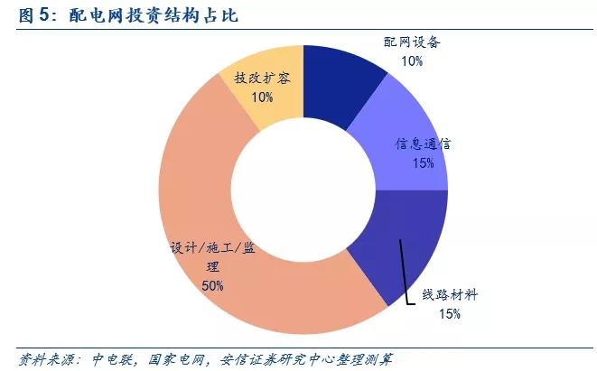 大范圍的投資包括感知層、網(wǎng)絡(luò)層、平臺層和應(yīng)用層,其中感知層是對現(xiàn)有電網(wǎng)二次設(shè)備投資的全覆蓋,網(wǎng)絡(luò)層和平臺層則會因泛在建設(shè)增加新的內(nèi)涵,而應(yīng)用層未來則是基于電力大數(shù)據(jù)增值服務(wù)的應(yīng)用場景。大范圍的投資我們認為需要基于對電網(wǎng)公司的整體投資來定,并按照電網(wǎng)整體的投資規(guī)模、配電網(wǎng)投資占比及其構(gòu)成等作如下假設(shè):