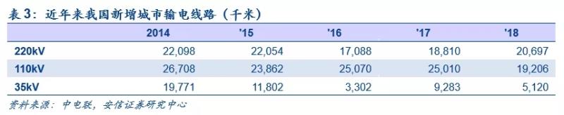 2018年,我國新增110kV和35kV輸電線路分別為19,206千米和5,120千米。假設(shè)電纜化率從100%降低到50%,以2018的的線路工程量測算可壓減投資規(guī)模將達到914億元,如果再考慮10kV及以下的配電線路改造,我們預計僅城市架空線改埋溝線一項就可以壓減投資達到1000億以上。