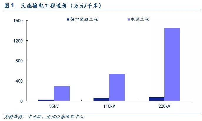 通常,220kV以下線路主要為城市配電網(wǎng)線路。根據(jù)中電聯(lián)歷年公布的交流輸電工程造價,電纜工程的造價通常為架空輸電線路造價的10倍。2018年,110kV和220kV交流電纜工程的造價分別為874萬元/千米和2820萬元/千米;而交流架空線的造價則分別為66萬元/千米和112萬元/千米。