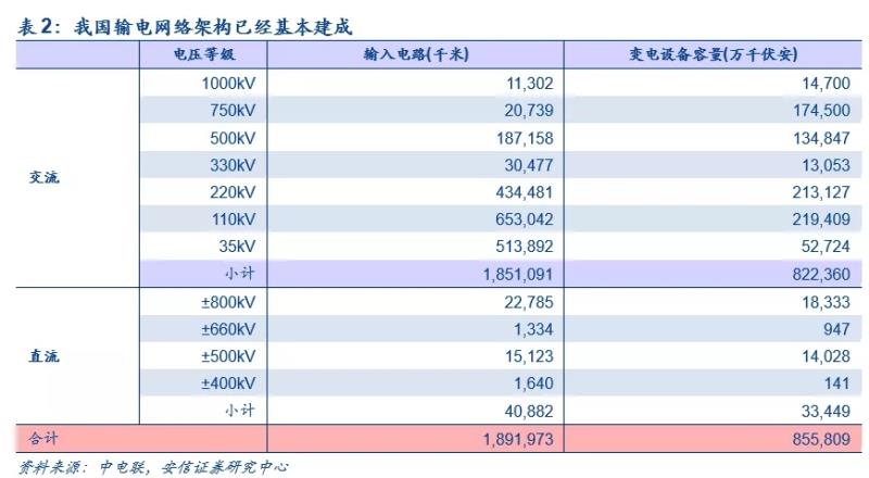 經(jīng)過10多年的發(fā)展建設(shè),我國220千伏及以上輸電網(wǎng)網(wǎng)架日趨完善,安全穩(wěn)定水平顯著增強。到2018年末,我國已建成35kV以上輸電回路總長度達到189.25萬千米,其中直流輸電線路4.1萬千米,交流輸電線路185.11萬千米;35kV以上變電/換流容量69.88億kVA,其中直流換流容量3.34億kVA,交流變電容量66.53億kVA。