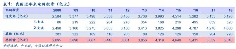 1、電網(wǎng)投資規(guī)模或?qū)⒈3值驮鲩L的態(tài)勢。從電網(wǎng)企業(yè)本身的投資能力來看,由于2018/19連續(xù)兩年要求一般工商業(yè)電價下降10%,電網(wǎng)企業(yè)的盈利能力和再投資能力也將受到限制。2018年度,國家電網(wǎng)公司售電量增長9.3%,營收增長8.7%,但利潤下滑14.3%。2019年,國家電網(wǎng)公司規(guī)劃電網(wǎng)投資5,126億元,同比增長4.8%;資產(chǎn)總額4.17萬億元,同比增長6.1%。綜合考慮用電量增長、電網(wǎng)建設(shè)階段及電網(wǎng)企業(yè)投資能力來看,我們認為未來幾年電網(wǎng)投資規(guī)模將保持在3-5%。