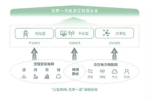 2019年初,國家電網有限公司黨組以習近平新時代中國特色社會主義思想為指導,深入貫徹落實“四個革命、一個合作”能源安全新戰(zhàn)略,順應能源革命和數字革命融合發(fā)展趨勢,創(chuàng)造性提出了“三型兩網、世界一流”的戰(zhàn)略目標,其中,“三型”是指樞紐型、平臺型、共享型企業(yè),圍繞產業(yè)屬性、網絡屬性、社會屬性明確了發(fā)展方向;“兩網”是指堅強智能電網和泛在電力物聯(lián)網,二者相輔相成、融合發(fā)展,形成強大的價值創(chuàng)造平臺(見圖1)。