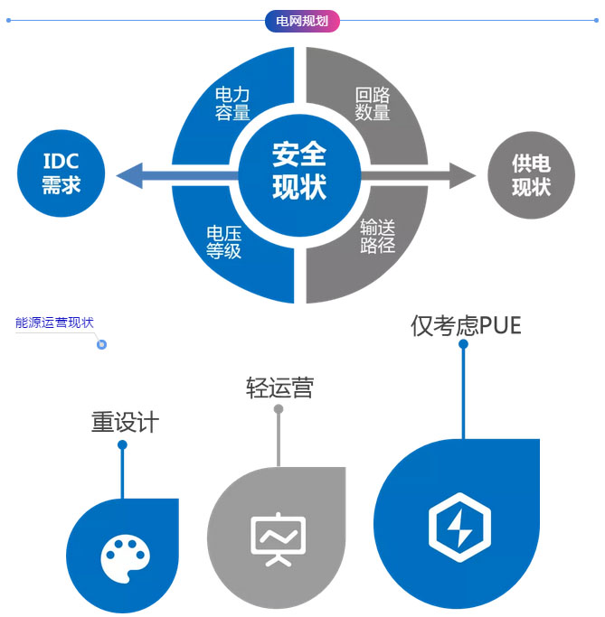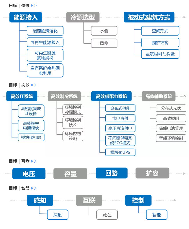 從能源的供給、配置、使用及管理的全過程四個(gè)階段提出IDC能源應(yīng)用的現(xiàn)狀,為有的放矢,結(jié)合以上幾個(gè)痛點(diǎn),站在時(shí)間維度上提出綜合能源解決方案的目標(biāo),從能源的供給、配置、使用及管理上提出供給端低碳、配置端高效,使用端的可靠以及管理端的智慧,實(shí)現(xiàn)能源的全過程目標(biāo)管控。