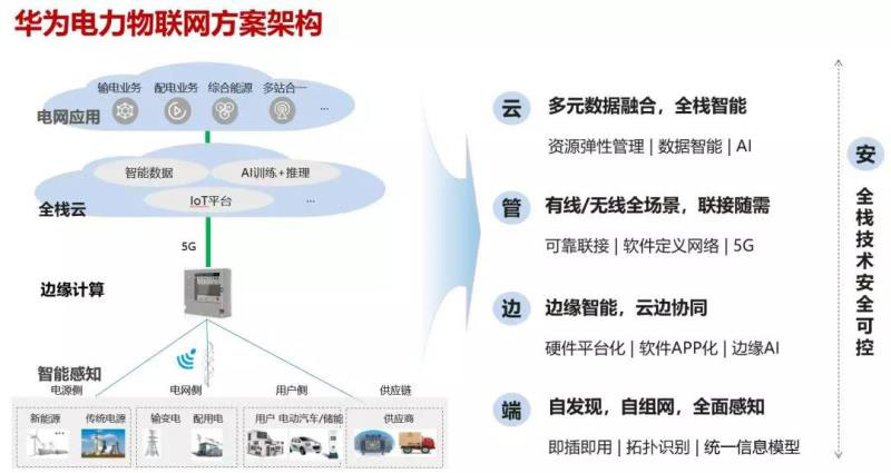 華為構(gòu)建了“云管邊端”的電力物聯(lián)網(wǎng)方案架構(gòu),并且由端到云全棧技術(shù)安全可控?!霸啤庇蒊oT平臺(tái)、智能數(shù)據(jù)和AI共同構(gòu)建數(shù)字化底座,并支撐電網(wǎng)業(yè)務(wù)云化應(yīng)用;“管”提供可靠聯(lián)接,有線/無(wú)線全場(chǎng)景隨需靈活聯(lián)接;“邊”具備邊緣計(jì)算、云邊協(xié)同和AI能力;“端”全面感知電網(wǎng)信息,支持自描述、自發(fā)現(xiàn)和即插即用。