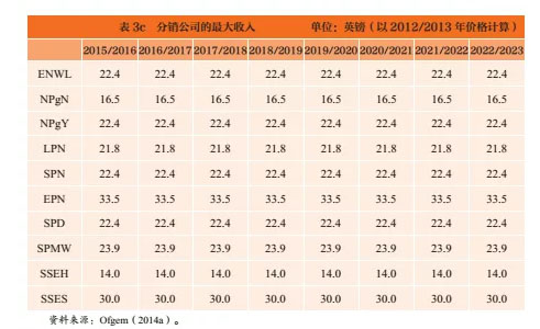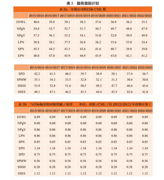 在提供降低成本的強(qiáng)大誘因的同時(shí),也會(huì)有強(qiáng)烈的動(dòng)機(jī)來(lái)提高服務(wù)質(zhì)量。在分銷層面,英國(guó)制定政策鼓勵(lì)每年減少客戶電力中斷(CMI)和客戶電力分鐘損失(CML)。表 3 顯示了在價(jià)格控制期內(nèi) CML 減少的激勵(lì)情況,其中表3a 顯示每個(gè)分銷公司的目標(biāo) CML 數(shù),表 3b 顯示了與目標(biāo)偏差的對(duì)稱獎(jiǎng)勵(lì) / 懲罰,表 3c 顯示了每家公司的最大收入(上漲或下跌),數(shù)額被設(shè)定為 CML 總收入的 1.8%(以及 CMI 總收入的 1.2%)。
