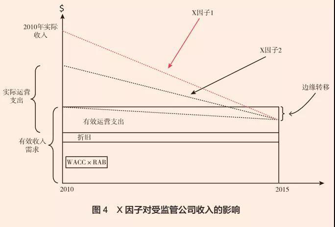價(jià)格控制過(guò)程中存在許多關(guān)鍵因素,包括受監(jiān)管資產(chǎn)基數(shù)(RAB),允許公司根據(jù)該基數(shù)獲得回報(bào)。雖然此基數(shù)的初始值確定起來(lái)有些困難,但后續(xù)更新卻相對(duì)簡(jiǎn)單,可以根據(jù)約定的資本基數(shù)和允許折舊條件直接更新。允許回報(bào)率或加權(quán)平均資本成本(WACC)根據(jù)適當(dāng)?shù)娘L(fēng)險(xiǎn)因素和杠桿比率進(jìn)行計(jì)算。有效的運(yùn)營(yíng)支出水平(OPEX)則需要與資本支出(CAPEX)協(xié)調(diào)。資本支出本身要求認(rèn)真審核所提議的投資是否有必要以及能否高效完成。圖 4 為受監(jiān)管公司 2010 年的初始收入與其有效的收入水平以及 X 因子的不同場(chǎng)景比較,以便到 2015 年將其收入降低到有效水平。