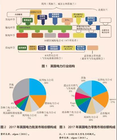 1990 年開(kāi)始的電力行業(yè)改革極大地改變了英國(guó)電力行業(yè)的參與主體(Henney,1994;Newbery,2000,2005;Pollitt,1999,2012)。在英格蘭和威爾士,壟斷的公共發(fā)電和輸電公司(英國(guó)中央電力產(chǎn)業(yè)局)解體, 12 個(gè)區(qū)域配電和零售公司得以進(jìn)入發(fā)電市場(chǎng),并相互競(jìng)爭(zhēng)零售用戶(合法劃分零售業(yè)務(wù))。在蘇格蘭和北愛(ài)爾蘭,大型一體化發(fā)電、電網(wǎng)和零售公司也面臨解體和競(jìng)爭(zhēng)。截至 2018 年年中,英國(guó)共有 170 家執(zhí)證發(fā)電商和 64 家執(zhí)證外資電力零售商(英國(guó)天然氣電力市場(chǎng)辦公室,2018 年)。圖 1 為英國(guó)目前的電力行業(yè)結(jié)構(gòu),可以看出,英國(guó)發(fā)電和零售業(yè)務(wù)已被 6“大”發(fā)電商和零售商所占據(jù),這 6 家公司源自幾家大型公司。英格蘭和威爾士的輸電業(yè)務(wù)歸屬英國(guó)國(guó)家電網(wǎng),配電業(yè)務(wù)則主要?dú)w屬 6 大公司,其中包括英國(guó)電網(wǎng)公司(UKPN)和 WPD 公司。英國(guó)國(guó)家電網(wǎng)是整個(gè)英國(guó)電力系統(tǒng)的運(yùn)營(yíng)方。某些公司仍對(duì)發(fā)電、配電和零售有興趣,但這類公司在市場(chǎng)上并不普遍,而且電力行業(yè)對(duì)配電網(wǎng)業(yè)務(wù)的競(jìng)爭(zhēng)部分有嚴(yán)格的分類計(jì)價(jià)。獨(dú)立電力項(xiàng)目和新零售商雖然從 6“大”公司搶走相當(dāng)部分的市場(chǎng)份額,但這些新發(fā)電商和零售商的市場(chǎng)份額并不足以與 6“大”公司匹敵。