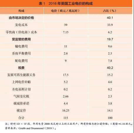 2016 年,英國(guó)年用電量 2000 兆瓦時(shí)以上工業(yè)電價(jià)構(gòu)成中(見(jiàn)表 1),40% 由市場(chǎng)決定, 20% 由監(jiān)管機(jī)構(gòu)決定, 40% 由中央政府決定。各組成部分并不與系統(tǒng)中不同參與者的收益對(duì)應(yīng)。以批發(fā)價(jià)為例,化石燃料發(fā)電的批發(fā)價(jià)格本身還包含碳定價(jià)的成本,而發(fā)電商的收益也會(huì)包含他們的輸配電費(fèi)用。需要注意的是, 2016 年英國(guó)工業(yè)電價(jià)與 2015 年廣東工業(yè)電價(jià)基本持平( Pollitt et al., 2018)。