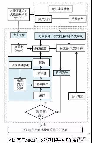 鄭衛(wèi)東[6]使用基于MRM的遺傳算法優(yōu)化方法對綜合能源系統(tǒng)進行優(yōu)化,優(yōu)化變量為原動機容量、電制冷比系數(shù)、太陽能發(fā)電面積占比。流程如圖2所示。