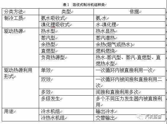 吸收式制冷機通過煙氣或熱水驅(qū)動,采用溴化鋰或氨水等制冷工質(zhì)制冷,是余熱利用常用的制冷設(shè)備。表1根據(jù)工質(zhì)、驅(qū)動熱源、利用方式和用途對吸收式制冷機進行分類[13]。