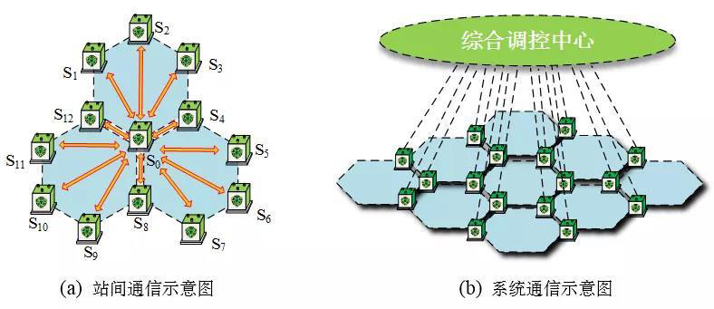 2)站間通信與系統(tǒng)通信的雙層通信機(jī)制:站間通信是指基站與關(guān)聯(lián)微網(wǎng)的所有基站之間的相互通信,對(duì)關(guān)聯(lián)微網(wǎng)運(yùn)行狀態(tài)信息的實(shí)時(shí)共享。系統(tǒng)通信是指各基站與上層綜合調(diào)控中心之間的通信,確保上層綜合調(diào)控中心實(shí)時(shí)掌握有源配電網(wǎng)中全部微網(wǎng)的運(yùn)行狀態(tài),以便做出全局優(yōu)化調(diào)控決策和協(xié)調(diào)控制。站間通信和系統(tǒng)通信如圖6(a)和(b)所示。