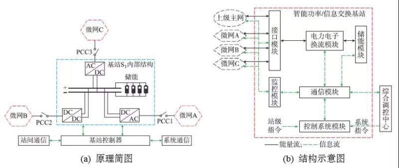 1)智能功率/信息交換基站:智能功率/信息交換基站是一種帶有儲(chǔ)能裝置、多端、可交直流混合接入的電力電子設(shè)備,主要功能是監(jiān)測(cè)關(guān)聯(lián)微網(wǎng)的運(yùn)行狀態(tài)、功率平衡輔助控制以及信息交互處理等。它是實(shí)現(xiàn)本文所提蜂巢狀有源配電網(wǎng)拓?fù)涞暮诵脑O(shè)備與關(guān)鍵技術(shù),它的結(jié)構(gòu)示意圖和原理簡(jiǎn)圖分別如圖5(a)和(b)所示。