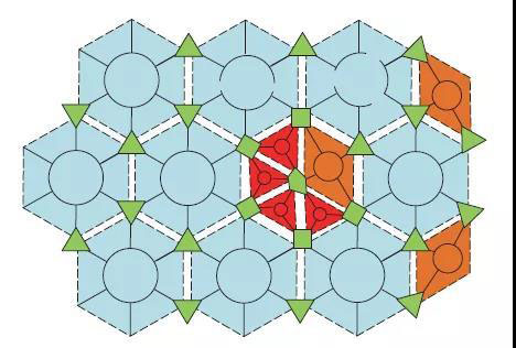 實(shí)際工程中,微網(wǎng)的關(guān)聯(lián)拓?fù)浣Y(jié)構(gòu)可根據(jù)配電網(wǎng)規(guī)模、劃分的微網(wǎng)區(qū)域/數(shù)量大小、供電可靠性與靈活性以及經(jīng)濟(jì)性等多方面綜合優(yōu)化確定,如某一供電區(qū)域大部分以六邊形結(jié)構(gòu)的微網(wǎng)鋪展覆蓋,但少部分區(qū)域仍可以根據(jù)實(shí)際需求選擇以三角形或四邊形的微網(wǎng)鋪展,即圖4中的紅色和橙色區(qū)域所示。