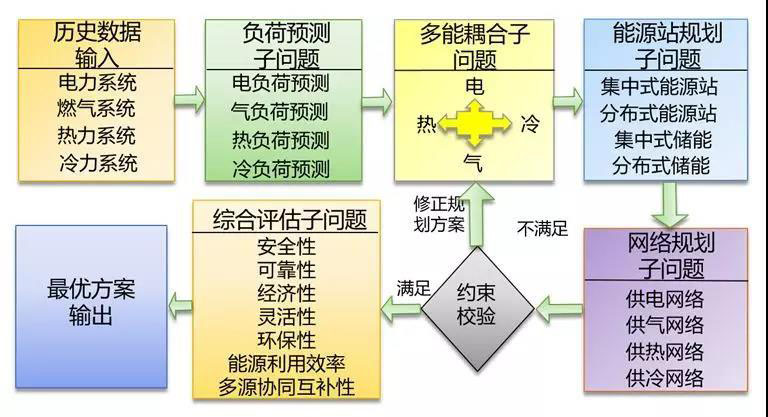 由于多能耦合密切,DIES的優(yōu)化空間廣泛。存在于源、網(wǎng)、荷、儲(chǔ)等 各個(gè)環(huán)節(jié)。國(guó)內(nèi)外對(duì) DIES規(guī)劃的早期探索主要集中于以某一種典型耦合設(shè)備(CHP和CCHP等)為核心或少數(shù)幾種確定的設(shè)備組成的小型供能系統(tǒng),以及“以熱定電”等相關(guān)運(yùn)行策略的制定,未充分考慮系統(tǒng)設(shè)備選型的優(yōu)化空間。后續(xù)DIES規(guī)劃一般基于Energy Hub理論,并通過分層建模求解實(shí)現(xiàn)設(shè)備選型選址定容與運(yùn)行調(diào)度方案的協(xié)同優(yōu)化。目前對(duì)DIES的規(guī)劃工作基本上側(cè)重于某一點(diǎn),如能源站規(guī)劃、能源網(wǎng)絡(luò)規(guī)劃、儲(chǔ)能規(guī)劃或綜合需求側(cè)管理等,尚未形成較成熟的源、網(wǎng)、荷、儲(chǔ)一體化規(guī)劃,對(duì)于各環(huán)節(jié)間的耦合與優(yōu)勢(shì)互補(bǔ)挖掘不足。綜合目前的研究工作,完整的DIES規(guī)劃應(yīng)如下圖所示。