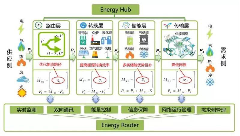 能源路由器 (Energy Router) 概念是由美國(guó)北卡州立大學(xué) FREEDM中心的Alex Q. Huang提出的用于解決DIES能源耦合過程中信息流問題的模型。Energy Router側(cè)重于DIES的通信、控制與管理。Energy Router從信息層面對(duì)Energy Hub提供支持,有利于促進(jìn)未來(lái)DIES的進(jìn)一步發(fā)展。