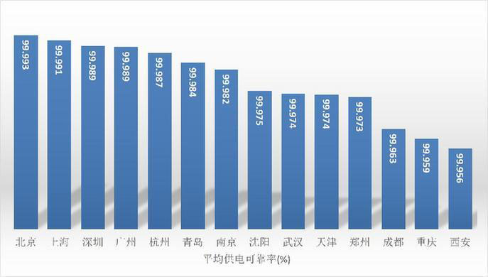 中國儲能網(wǎng)訊:2018年,全國14個(gè)特大及以上城市(按住房和城鄉(xiāng)建設(shè)部城市交通工程技術(shù)中心《2018年度中國主要城市道路網(wǎng)密度檢測報(bào)告》中的城市名單統(tǒng)計(jì))供電企業(yè)踐行“以人民為中心”的發(fā)展思想,供電可靠性指標(biāo)持續(xù)向好,供電可靠率均達(dá)到99.95%以上,優(yōu)化了營商環(huán)境,推動了人民群眾由“用上電”向“用好電”的轉(zhuǎn)變。各城市的平均供電可靠率詳見圖1。