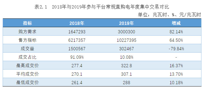 參與平臺常規(guī)直購電年度集中交易的購方需求、售方指標、價格均大幅上漲,成交量、成交占比急劇下滑,詳見表2.1。
