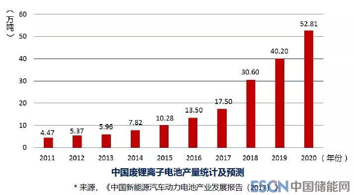 數(shù)據(jù)顯示,預(yù)計(jì)到2020年,我國電動汽車?yán)塾?jì)保有量將達(dá)到500萬輛,2030年保有量將達(dá)5000萬輛以上,以配置80kWh電池為參考,等效儲能容量將達(dá)到40億kWh,同時(shí)電動汽車退役電池梯次利用存量達(dá)4億kWh。