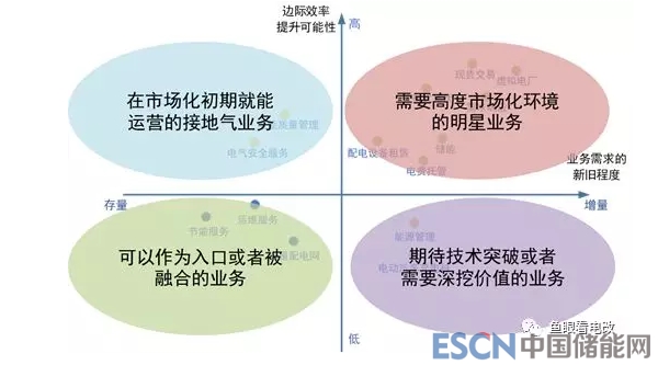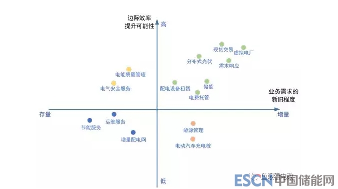就商業(yè)模式來說,我們肯定覺得“新的需求+高邊際效率”的業(yè)務(wù)(右上角象限)是最有前途的,互聯(lián)網(wǎng)企業(yè)的打法也都是聚焦在這個象限。但是就電力行業(yè)來說,這個象限并不是所有的業(yè)務(wù)都馬上能落地的,原因是:電力或者能源行業(yè)并未如零售消費(fèi)端那樣徹底市場化,其結(jié)果就是業(yè)務(wù)受政策影響很大,不確定性很高。比如儲能業(yè)務(wù),可能工商業(yè)電價一下降,或者工商業(yè)可轉(zhuǎn)為兩部制電價的政策一落地,工商業(yè)儲能業(yè)務(wù)的短期風(fēng)險就會快速增加。