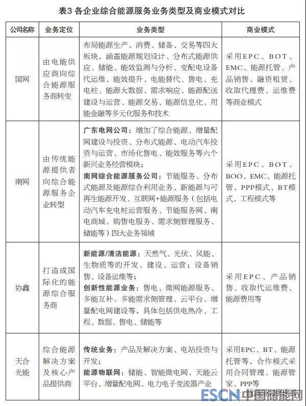 就企業(yè)對綜合能源服務(wù)業(yè)務(wù)的定位而言,國網(wǎng)、南網(wǎng)、協(xié)鑫都致力于向綜合能源服務(wù)商轉(zhuǎn)型,而天合光能致力于做提供綜合能源解決方案的服務(wù)商。就業(yè)務(wù)類型而言,由于園區(qū)、工業(yè)、大型公共建筑等對象承擔(dān)的能源價(jià)格較高、能源需求巨大、用能形式豐富,能夠取得較好的經(jīng)濟(jì)、環(huán)境、社會效益,目前,綜合能源服務(wù)企業(yè)一致將重點(diǎn)放在這三類服務(wù)對象上,統(tǒng)籌運(yùn)用能效診斷、節(jié)能改造、用能監(jiān)測、分布式新能源發(fā)電、冷熱電三聯(lián)供、儲能等多種技術(shù),積極推進(jìn)綜合能源服務(wù)業(yè)務(wù)。因此,其業(yè)務(wù)類型大致相近,且商業(yè)模式創(chuàng)新不足,均在積極探索中。見表3。