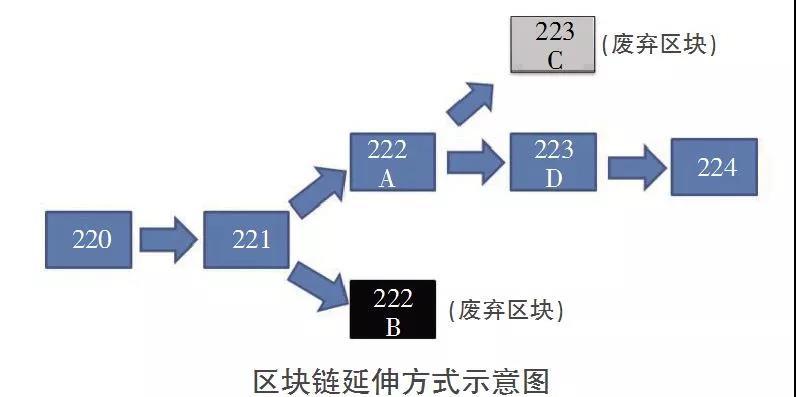 如下圖,在對222區(qū)塊記錄時,A、B兩個節(jié)點同時解出了哈希值(身份證號)并對外進(jìn)行了廣播,部分節(jié)點會記錄222A區(qū)塊,而其他節(jié)點會記錄222B區(qū)塊。這時原本完整的鏈就會在222區(qū)塊分叉成兩列。若驗證了后續(xù)223塊區(qū)塊哈希值的節(jié)點認(rèn)可A解出了222塊區(qū)塊這一事實,則222B這個區(qū)塊會被作為側(cè)鏈而廢棄。原來認(rèn)可B解出了222塊區(qū)塊的節(jié)點就會轉(zhuǎn)到222A—223D 這條鏈上去,參與下一個區(qū)塊224的解。222A這筆記錄就會被確認(rèn)且?guī)缀醪豢筛摹?