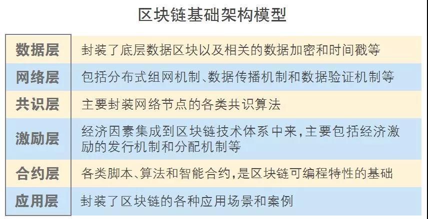 區(qū)塊鏈系統(tǒng)由數(shù)據(jù)層、網(wǎng)絡(luò)層、共識層、激勵層、合約層和應(yīng)用層組成?;跁r間戳的鏈?zhǔn)絽^(qū)塊結(jié)構(gòu)、分布式節(jié)點的共識機(jī)制、基于共識算力的經(jīng)濟(jì)激勵和靈活可編程的智能合約是區(qū)塊鏈技術(shù)最具代表性的創(chuàng)新點。