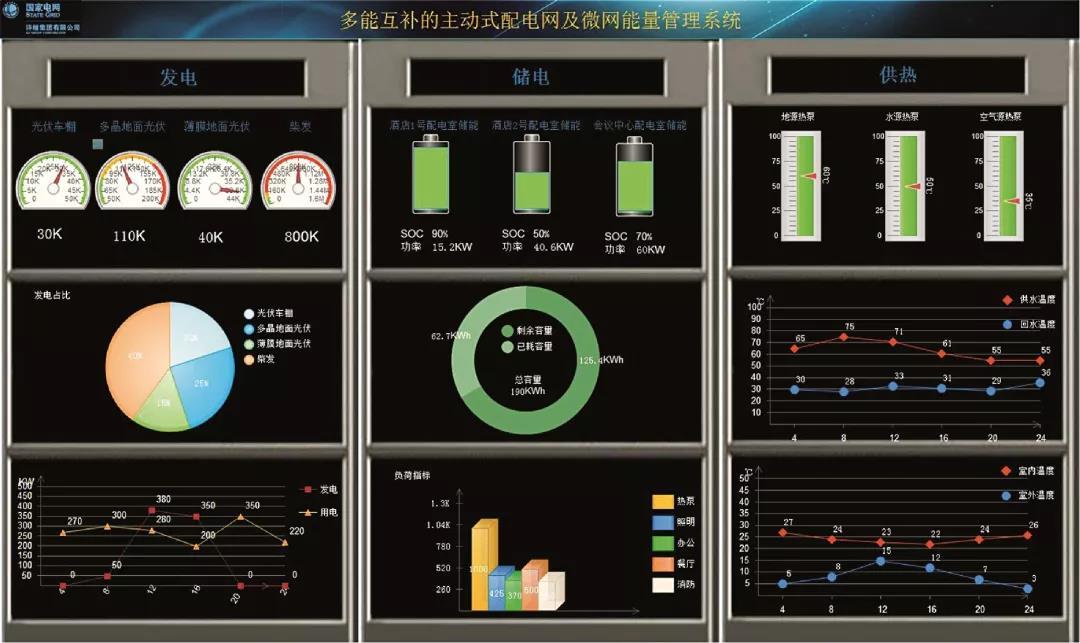 億利多能互補主動配電網(wǎng)系統(tǒng)功能如圖4所示,通過對光、柴、儲、負(fù)荷等各個環(huán)節(jié)統(tǒng)一的監(jiān)視、控制、管理與調(diào)度等,并網(wǎng)運行時最大限度消納分布式電源、提高供能經(jīng)濟性及電能質(zhì)量要求,離網(wǎng)運行時保證負(fù)荷供電及穩(wěn)定運行,同時能夠監(jiān)控?zé)岜脵C組的運行狀態(tài)、機組負(fù)荷、供回水溫度、流量、水源側(cè)進出溫度、機組耗電量等,實現(xiàn)供能優(yōu)化。