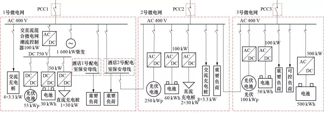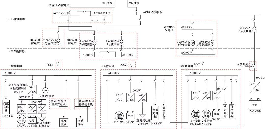 并網(wǎng)運行時,綜合優(yōu)化分布式光伏、分布式儲能、集中式儲能及電動汽車,提高分布式電源的利用率,驗證3個不同類型微電網(wǎng)的平滑功率控制、聯(lián)合優(yōu)化控制以及需求側(cè)響應(yīng)等能量管理策略;通過集中儲能降低配電網(wǎng)功率波動并進行削峰填谷控制,并根據(jù)酒店、會議中心和電動汽車的用電特性,綜合考慮冷、熱及電需求供應(yīng),設(shè)計燃油發(fā)電、光伏發(fā)電及水蓄熱等等互補調(diào)峰策略,實現(xiàn)區(qū)域內(nèi)多種能源的安全穩(wěn)定供應(yīng)及經(jīng)濟高效運行。當(dāng)911/912某一供電線路停電時導(dǎo)致單個微電網(wǎng)上級電網(wǎng)失電時通過負(fù)荷轉(zhuǎn)移恢復(fù)微電網(wǎng)供電。