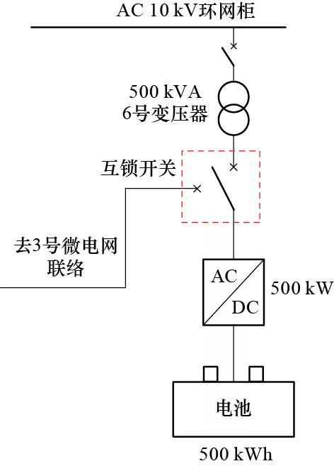集中儲能系統(tǒng)500?kWh,輸出電壓為400?V交流電,經(jīng)過變壓器升壓接入10?kV環(huán)網(wǎng)柜,同時與3號微網(wǎng)連接,10?kV與400?V接入要求互鎖,并網(wǎng)運行滿足主動配電網(wǎng)的協(xié)調(diào)控制和優(yōu)化調(diào)度要求,離網(wǎng)運行時接入3號微電網(wǎng),提供供電支撐。