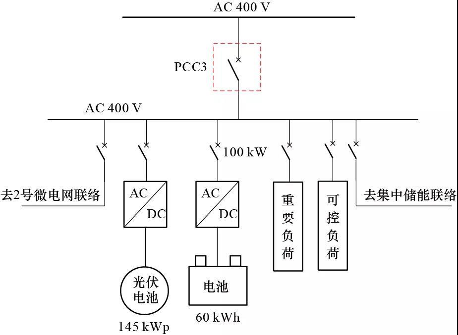 3號微電網(wǎng)包括光伏發(fā)電、儲能、重要負(fù)荷和可控符合,重點驗證重要負(fù)荷的無縫供電。3號微電網(wǎng)接線如圖7所示,3號微電網(wǎng)通過PCC3點并網(wǎng),光伏發(fā)電145?kW、儲能60?kWh,儲能變流器100?kW,滿足重要負(fù)荷無縫供電。