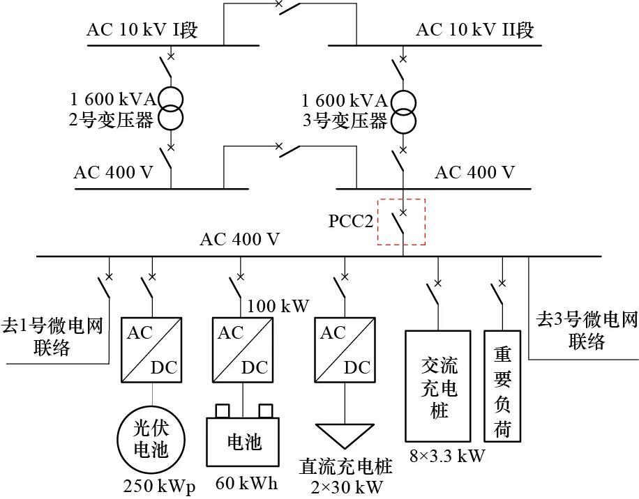 2號微電網(wǎng)包括光伏發(fā)電、儲能、充電樁及負(fù)荷,重點驗證高滲透率分布式光伏接入的穩(wěn)定控制。2號微電網(wǎng)接線如圖6所示,2號微電網(wǎng)通過PCC2并網(wǎng),光伏發(fā)電250?kW,儲能60?kWh,儲能變流器100?kW,2臺30?kW直流充電樁,8臺7?kW交流充電樁。