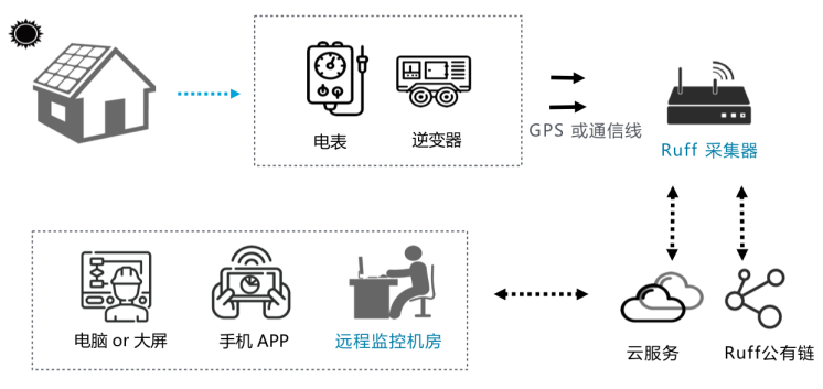 首先,Ruff在電站中安裝了一個(gè)自主研發(fā)的物聯(lián)網(wǎng)智能網(wǎng)關(guān)(即采集器),采集器一端連著逆變器,逆變器具有電站發(fā)電量統(tǒng)計(jì)的能力,但是并不十分精準(zhǔn),因此采集器通過接入逆變器來監(jiān)控電站的運(yùn)行狀態(tài),以判斷故障來源及因素;采集器的另一端連接著電表,直接讀取發(fā)電量數(shù)據(jù),完全避免了逆變器與電表之間的電量誤差。數(shù)據(jù)通過采集器收集之后,傳輸?shù)皆贫?,而在這個(gè)過程中,Ruff采集器首先會進(jìn)行第一次的本地邊緣計(jì)算,從而上傳客戶需要的發(fā)電量數(shù)據(jù),不會把沒有用的發(fā)電量數(shù)據(jù)上傳到云端及鏈上,從而浪費(fèi)存儲空間。