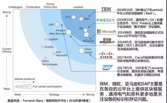 物聯(lián)網(wǎng)龍頭紛紛開始布局區(qū)塊鏈,根據(jù)Forrester Wave:物聯(lián)網(wǎng)軟件平臺(tái)(2016年第4季度)的報(bào)告顯示, IBM、PTC、GE和微軟已成為占據(jù)物聯(lián)網(wǎng)平臺(tái)市場(chǎng)的主導(dǎo)企業(yè)。SAP、AWS、Cisco、LogMeln、Exosite、Ayla Networks和Zebra Technologies名列前11名。