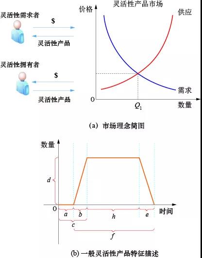 圖4中的(a)、(b)兩圖分別給出了靈活性市場的核心理念和針對一般靈活性產(chǎn)品的特征描述。供需雙方需要首先確定靈活性商品的一般特征參數(shù),如功率范圍、響應速度和時長等。在產(chǎn)品特征描述達成共識的前提下,靈活性需求者和靈活性擁有者在基于供求理論的市場中分別對其所買/所賣的靈活商品進行控制、管理、定價和交易。在靈活性的控制和管理上,各種直接和間接的控制手段都可以用來控制獨立的靈活性資源或者基于聚合方式(aggregation)的大量靈活性資源。