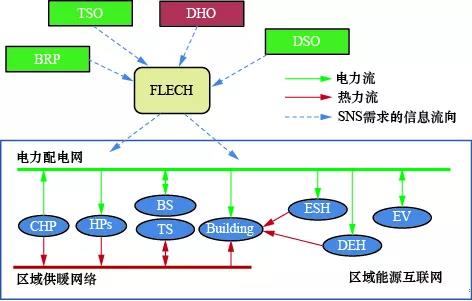 北港(Nordhavn)作為丹麥首都哥本哈根的老港口區(qū)目前正被改造成一個至少擁有4萬居民的新型城市社區(qū)。由丹麥能源技術發(fā)展和示范基金會(Danish Energy Technology Development and Demonstration Programme,EUDP)出資1 100萬歐元所支持的Energylab Nordhavn項目(2015–2019年)正在北港地區(qū)示范以電熱互聯(lián)為主體的城市區(qū)域能源互聯(lián)網(wǎng)工程。如圖6所示,該工程沿用了FLECH的理念,并將其拓展到熱力系統(tǒng),使該區(qū)域內(nèi)的熱力公司(district heating operator,DHO)也可參與受益。系統(tǒng)中靈活性來源包括大型熱電聯(lián)產(chǎn)設備,各類熱泵, 大型電力儲能(battery storage,BS)與熱力儲能(thermal storage,TS)設備,電動汽車(electric vechile,EV),智能樓宇和為低溫區(qū)域供暖系統(tǒng)提供二次升溫的直接加熱設備(direct electric heater,DEH)以及具有儲能功能的電加熱器等(electric storage heater,ESH)。在靈活性產(chǎn)品方面,該項目截至目前已經(jīng)為區(qū)域內(nèi)所涉獵的4個靈活性需求方設計了以電、熱負荷聯(lián)合調(diào)度為代表的9類智慧能源網(wǎng)絡服務(smart network services,SNSs)產(chǎn)品, 用于優(yōu)化協(xié)調(diào)區(qū)域內(nèi)部電網(wǎng),熱網(wǎng),靈活性設備,傳統(tǒng)電、熱負荷,以及各相關利益主體之間的運作。